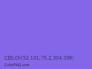 CIELCh 52.101,75.2,304.338 Color is a light indigo color and the nearest color is Medium Slate Blue #7b68ee. Hex code #8466e8 and RGB value is rgb(132,102,232). In RGB color space, this color is composed of 52% red, 40% green, 91% blue, In CMYK color space, this color is composed of 43% cyan, 56% magenta, 0% yellow , 9% black , In HSL color space, this color has a hue angle of 254° , 74% saturation and 65% lightness.