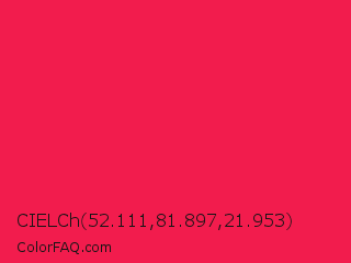 CIELCh 52.111,81.897,21.953 Color is a normal red color and the nearest color is Red Crayola #ee204d. Hex code #f21c4d and RGB value is rgb(242,28,77). In RGB color space, this color is composed of 95% red, 11% green, 30% blue, In CMYK color space, this color is composed of 0% cyan, 88% magenta, 68% yellow , 5% black , In HSL color space, this color has a hue angle of 346° , 89% saturation and 53% lightness.