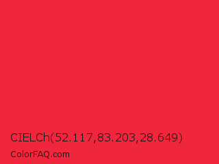 CIELCh 52.117,83.203,28.649 Color is a normal red color and the nearest color is Imperial Red #ed2939. Hex code #f0263d and RGB value is rgb(240,38,61). In RGB color space, this color is composed of 94% red, 15% green, 24% blue, In CMYK color space, this color is composed of 0% cyan, 84% magenta, 75% yellow , 6% black , In HSL color space, this color has a hue angle of 353° , 87% saturation and 55% lightness.