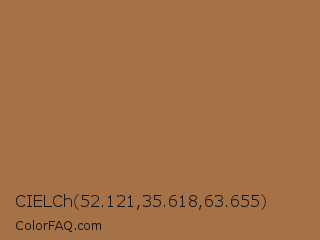 CIELCh 52.121,35.618,63.655 Color is a normal orange color and the nearest color is Cape Palliser #a26645. Hex code #a57146 and RGB value is rgb(165,113,70). In RGB color space, this color is composed of 65% red, 44% green, 27% blue, In CMYK color space, this color is composed of 0% cyan, 32% magenta, 58% yellow , 35% black , In HSL color space, this color has a hue angle of 27° , 40% saturation and 46% lightness.