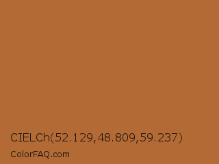 CIELCh 52.129,48.809,59.237 Color is a normal orange color and the nearest color is Copper #b87333. Hex code #b46a34 and RGB value is rgb(180,106,52). In RGB color space, this color is composed of 71% red, 42% green, 20% blue, In CMYK color space, this color is composed of 0% cyan, 41% magenta, 71% yellow , 29% black , In HSL color space, this color has a hue angle of 25° , 55% saturation and 45% lightness.