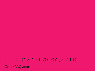 CIELCh 52.134,78.761,7.749 Color is a normal rose color and the nearest color is Razzmatazz #e3256b. Hex code #f0176e and RGB value is rgb(240,23,110). In RGB color space, this color is composed of 94% red, 9% green, 43% blue, In CMYK color space, this color is composed of 0% cyan, 90% magenta, 54% yellow , 6% black , In HSL color space, this color has a hue angle of 336° , 88% saturation and 52% lightness.