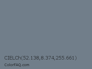 CIELCh 52.138,8.374,255.661 Color is a normal blue color and the nearest color is Raven #727b89. Hex code #717e8a and RGB value is rgb(113,126,138). In RGB color space, this color is composed of 44% red, 49% green, 54% blue, In CMYK color space, this color is composed of 18% cyan, 9% magenta, 0% yellow , 46% black , In HSL color space, this color has a hue angle of 209° , 10% saturation and 49% lightness.