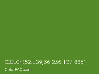CIELCh 52.139,56.256,127.885 Color is a normal green color and the nearest color is Maximum Green #5e8c31. Hex code #558a29 and RGB value is rgb(85,138,41). In RGB color space, this color is composed of 33% red, 54% green, 16% blue, In CMYK color space, this color is composed of 38% cyan, 0% magenta, 70% yellow , 46% black , In HSL color space, this color has a hue angle of 93° , 54% saturation and 35% lightness.