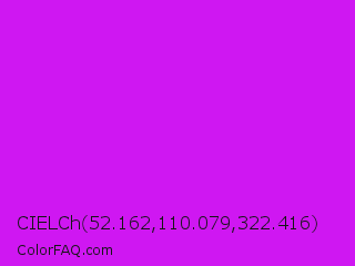CIELCh 52.162,110.079,322.416 Color is a normal purple color and the nearest color is Vivid Orchid #cc00ff. Hex code #cf17f2 and RGB value is rgb(207,23,242). In RGB color space, this color is composed of 81% red, 9% green, 95% blue, In CMYK color space, this color is composed of 14% cyan, 90% magenta, 0% yellow , 5% black , In HSL color space, this color has a hue angle of 290° , 89% saturation and 52% lightness.