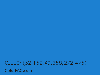 CIELCh 52.162,49.358,272.476 Color is a normal blue color and the nearest color is Bright Navy Blue #1974d2. Hex code #1c80d1 and RGB value is rgb(28,128,209). In RGB color space, this color is composed of 11% red, 50% green, 82% blue, In CMYK color space, this color is composed of 87% cyan, 39% magenta, 0% yellow , 18% black , In HSL color space, this color has a hue angle of 207° , 76% saturation and 46% lightness.