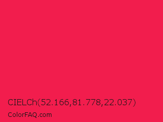 CIELCh 52.166,81.778,22.037 Color is a normal red color and the nearest color is Red Crayola #ee204d. Hex code #f21d4d and RGB value is rgb(242,29,77). In RGB color space, this color is composed of 95% red, 11% green, 30% blue, In CMYK color space, this color is composed of 0% cyan, 88% magenta, 68% yellow , 5% black , In HSL color space, this color has a hue angle of 346° , 89% saturation and 53% lightness.