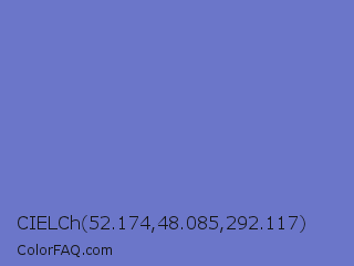 CIELCh 52.174,48.085,292.117 Color is a normal blue color and the nearest color is Toolbox #746cc0. Hex code #6b76c9 and RGB value is rgb(107,118,201). In RGB color space, this color is composed of 42% red, 46% green, 79% blue, In CMYK color space, this color is composed of 47% cyan, 41% magenta, 0% yellow , 21% black , In HSL color space, this color has a hue angle of 233° , 47% saturation and 60% lightness.
