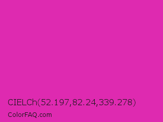 CIELCh 52.197,82.24,339.278 Color is a normal magenta color and the nearest color is Frostbite #e936a7. Hex code #de2ab0 and RGB value is rgb(222,42,176). In RGB color space, this color is composed of 87% red, 16% green, 69% blue, In CMYK color space, this color is composed of 0% cyan, 81% magenta, 21% yellow , 13% black , In HSL color space, this color has a hue angle of 315° , 73% saturation and 52% lightness.