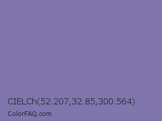 CIELCh 52.207,32.85,300.564 Color is a normal indigo color and the nearest color is Middle Blue Purple #8b72be. Hex code #8075ad and RGB value is rgb(128,117,173). In RGB color space, this color is composed of 50% red, 46% green, 68% blue, In CMYK color space, this color is composed of 26% cyan, 32% magenta, 0% yellow , 32% black , In HSL color space, this color has a hue angle of 252° , 25% saturation and 57% lightness.