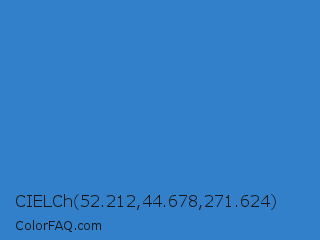 CIELCh 52.212,44.678,271.624 Color is a normal blue color and the nearest color is Cyan Blue Azure #4682bf. Hex code #3280c9 and RGB value is rgb(50,128,201). In RGB color space, this color is composed of 20% red, 50% green, 79% blue, In CMYK color space, this color is composed of 75% cyan, 36% magenta, 0% yellow , 21% black , In HSL color space, this color has a hue angle of 209° , 60% saturation and 49% lightness.