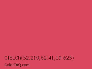 CIELCh 52.219,62.41,19.625 Color is a normal red color and the nearest color is Paradise Pink #e63e62. Hex code #db475c and RGB value is rgb(219,71,92). In RGB color space, this color is composed of 86% red, 28% green, 36% blue, In CMYK color space, this color is composed of 0% cyan, 68% magenta, 58% yellow , 14% black , In HSL color space, this color has a hue angle of 351° , 67% saturation and 57% lightness.