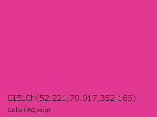 CIELCh 52.221,70.017,352.165 Color is a normal rose color and the nearest color is Cerise #da3287. Hex code #de388f and RGB value is rgb(222,56,143). In RGB color space, this color is composed of 87% red, 22% green, 56% blue, In CMYK color space, this color is composed of 0% cyan, 75% magenta, 36% yellow , 13% black , In HSL color space, this color has a hue angle of 329° , 72% saturation and 55% lightness.