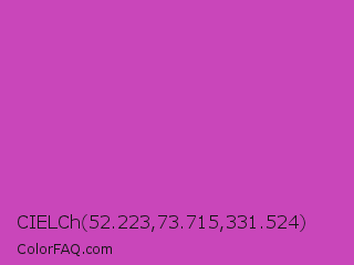 CIELCh 52.223,73.715,331.524 Color is a normal magenta color and the nearest color is Fuchsia Pink #c154c1. Hex code #c946ba and RGB value is rgb(201,70,186). In RGB color space, this color is composed of 79% red, 27% green, 73% blue, In CMYK color space, this color is composed of 0% cyan, 65% magenta, 7% yellow , 21% black , In HSL color space, this color has a hue angle of 307° , 55% saturation and 53% lightness.
