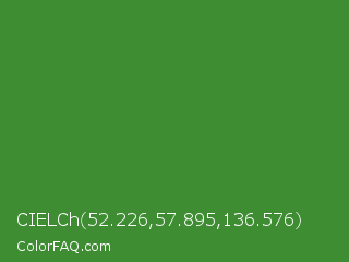 CIELCh 52.226,57.895,136.576 Color is a normal green color and the nearest color is May Green #4c9141. Hex code #3f8d33 and RGB value is rgb(63,141,51). In RGB color space, this color is composed of 25% red, 55% green, 20% blue, In CMYK color space, this color is composed of 55% cyan, 0% magenta, 64% yellow , 45% black , In HSL color space, this color has a hue angle of 112° , 47% saturation and 38% lightness.