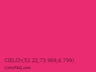 CIELCh 52.22,73.969,6.799 Color is a normal rose color and the nearest color is Razzmatazz #e3256b. Hex code #ea2a71 and RGB value is rgb(234,42,113). In RGB color space, this color is composed of 92% red, 16% green, 44% blue, In CMYK color space, this color is composed of 0% cyan, 82% magenta, 52% yellow , 8% black , In HSL color space, this color has a hue angle of 338° , 82% saturation and 54% lightness.