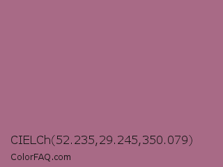 CIELCh 52.235,29.245,350.079 Color is a normal rose color and the nearest color is Tapestry #b05e81. Hex code #a86a86 and RGB value is rgb(168,106,134). In RGB color space, this color is composed of 66% red, 42% green, 53% blue, In CMYK color space, this color is composed of 0% cyan, 37% magenta, 20% yellow , 34% black , In HSL color space, this color has a hue angle of 333° , 26% saturation and 54% lightness.