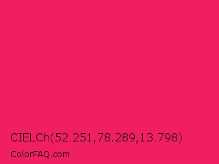 CIELCh 52.251,78.289,13.798 Color is a normal rose color and the nearest color is Razzmatazz #e3256b. Hex code #f01f61 and RGB value is rgb(240,31,97). In RGB color space, this color is composed of 94% red, 12% green, 38% blue, In CMYK color space, this color is composed of 0% cyan, 87% magenta, 60% yellow , 6% black , In HSL color space, this color has a hue angle of 341° , 87% saturation and 53% lightness.