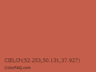 CIELCh 52.253,50.131,37.927 Color is a normal red color and the nearest color is Cedar Chest #c95a49. Hex code #c55e4a and RGB value is rgb(197,94,74). In RGB color space, this color is composed of 77% red, 37% green, 29% blue, In CMYK color space, this color is composed of 0% cyan, 52% magenta, 62% yellow , 23% black , In HSL color space, this color has a hue angle of 10° , 51% saturation and 53% lightness.