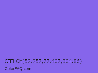 CIELCh 52.257,77.407,304.86 Color is a light indigo color and the nearest color is Medium Slate Blue #7b68ee. Hex code #8665eb and RGB value is rgb(134,101,235). In RGB color space, this color is composed of 53% red, 40% green, 92% blue, In CMYK color space, this color is composed of 43% cyan, 57% magenta, 0% yellow , 8% black , In HSL color space, this color has a hue angle of 255° , 77% saturation and 66% lightness.