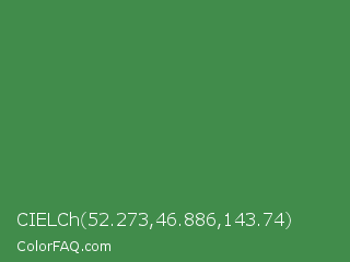 CIELCh 52.273,46.886,143.74 Color is a normal green color and the nearest color is May Green #4c9141. Hex code #418c4b and RGB value is rgb(65,140,75). In RGB color space, this color is composed of 25% red, 55% green, 29% blue, In CMYK color space, this color is composed of 54% cyan, 0% magenta, 46% yellow , 45% black , In HSL color space, this color has a hue angle of 128° , 37% saturation and 40% lightness.