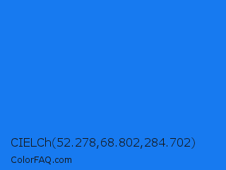 CIELCh 52.278,68.802,284.702 Color is a normal blue color and the nearest color is Blue Crayola #1f75fe. Hex code #177af0 and RGB value is rgb(23,122,240). In RGB color space, this color is composed of 9% red, 48% green, 94% blue, In CMYK color space, this color is composed of 90% cyan, 49% magenta, 0% yellow , 6% black , In HSL color space, this color has a hue angle of 213° , 88% saturation and 52% lightness.