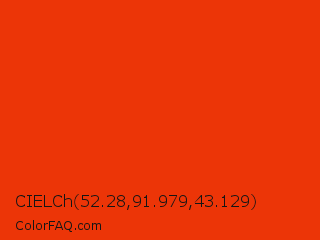 CIELCh 52.28,91.979,43.129 Color is a normal red color and the nearest color is Coquelicot #ff3800. Hex code #ec3507 and RGB value is rgb(236,53,7). In RGB color space, this color is composed of 93% red, 21% green, 3% blue, In CMYK color space, this color is composed of 0% cyan, 78% magenta, 97% yellow , 7% black , In HSL color space, this color has a hue angle of 12° , 94% saturation and 48% lightness.