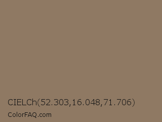 CIELCh 52.303,16.048,71.706 Color is a normal orange color and the nearest color is Cement #8d7662. Hex code #8f7963 and RGB value is rgb(143,121,99). In RGB color space, this color is composed of 56% red, 47% green, 39% blue, In CMYK color space, this color is composed of 0% cyan, 15% magenta, 31% yellow , 44% black , In HSL color space, this color has a hue angle of 30° , 18% saturation and 47% lightness.