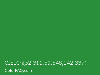 CIELCh 52.311,59.548,142.337 Color is a normal green color and the nearest color is Forest Green #228b22. Hex code #298f3a and RGB value is rgb(41,143,58). In RGB color space, this color is composed of 16% red, 56% green, 23% blue, In CMYK color space, this color is composed of 71% cyan, 0% magenta, 59% yellow , 44% black , In HSL color space, this color has a hue angle of 130° , 55% saturation and 36% lightness.