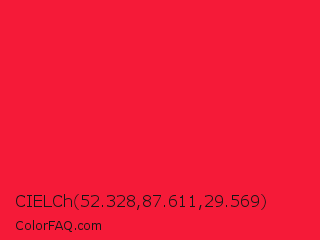 CIELCh 52.328,87.611,29.569 Color is a normal red color and the nearest color is Torch Red #fd0e35. Hex code #f51a38 and RGB value is rgb(245,26,56). In RGB color space, this color is composed of 96% red, 10% green, 22% blue, In CMYK color space, this color is composed of 0% cyan, 89% magenta, 77% yellow , 4% black , In HSL color space, this color has a hue angle of 352° , 92% saturation and 53% lightness.