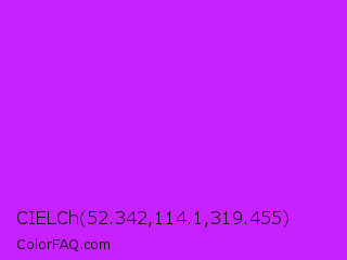 CIELCh 52.342,114.1,319.455 Color is a normal purple color and the nearest color is Vivid Orchid #cc00ff. Hex code #c721ff and RGB value is rgb(199,33,255). In RGB color space, this color is composed of 78% red, 13% green, 100% blue, In CMYK color space, this color is composed of 22% cyan, 87% magenta, 0% yellow , 0% black , In HSL color space, this color has a hue angle of 285° , 100% saturation and 56% lightness.