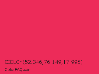 CIELCh 52.346,76.149,17.995 Color is a normal red color and the nearest color is Amaranth #e52b50. Hex code #ed2b59 and RGB value is rgb(237,43,89). In RGB color space, this color is composed of 93% red, 17% green, 35% blue, In CMYK color space, this color is composed of 0% cyan, 82% magenta, 62% yellow , 7% black , In HSL color space, this color has a hue angle of 346° , 84% saturation and 55% lightness.