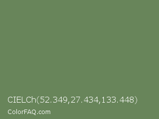 CIELCh 52.349,27.434,133.448 Color is a normal green color and the nearest color is Glade Green #61845f. Hex code #68855a and RGB value is rgb(104,133,90). In RGB color space, this color is composed of 41% red, 52% green, 35% blue, In CMYK color space, this color is composed of 22% cyan, 0% magenta, 32% yellow , 48% black , In HSL color space, this color has a hue angle of 100° , 19% saturation and 44% lightness.