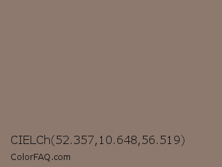 CIELCh 52.357,10.648,56.519 Color is a normal orange color and the nearest color is Almond Frost #907b71. Hex code #8d796e and RGB value is rgb(141,121,110). In RGB color space, this color is composed of 55% red, 47% green, 43% blue, In CMYK color space, this color is composed of 0% cyan, 14% magenta, 22% yellow , 45% black , In HSL color space, this color has a hue angle of 21° , 12% saturation and 49% lightness.