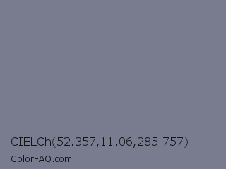 CIELCh 52.357,11.06,285.757 Color is a normal blue color and the nearest color is Waterloo #7b7c94. Hex code #797c8f and RGB value is rgb(121,124,143). In RGB color space, this color is composed of 47% red, 49% green, 56% blue, In CMYK color space, this color is composed of 15% cyan, 13% magenta, 0% yellow , 44% black , In HSL color space, this color has a hue angle of 232° , 9% saturation and 52% lightness.