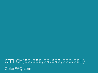 CIELCh 52.358,29.697,220.281 Color is a normal cyan color and the nearest color is Blue Chill #0c8990. Hex code #13899d and RGB value is rgb(19,137,157). In RGB color space, this color is composed of 7% red, 54% green, 62% blue, In CMYK color space, this color is composed of 88% cyan, 13% magenta, 0% yellow , 38% black , In HSL color space, this color has a hue angle of 189° , 78% saturation and 35% lightness.