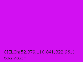 CIELCh 52.379,110.841,322.961 Color is a normal magenta color and the nearest color is Vivid Orchid #cc00ff. Hex code #d210f2 and RGB value is rgb(210,16,242). In RGB color space, this color is composed of 82% red, 6% green, 95% blue, In CMYK color space, this color is composed of 13% cyan, 93% magenta, 0% yellow , 5% black , In HSL color space, this color has a hue angle of 292° , 90% saturation and 51% lightness.