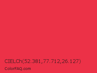 CIELCh 52.381,77.712,26.127 Color is a normal red color and the nearest color is Amaranth #e52b50. Hex code #ec3147 and RGB value is rgb(236,49,71). In RGB color space, this color is composed of 93% red, 19% green, 28% blue, In CMYK color space, this color is composed of 0% cyan, 79% magenta, 70% yellow , 7% black , In HSL color space, this color has a hue angle of 353° , 83% saturation and 56% lightness.