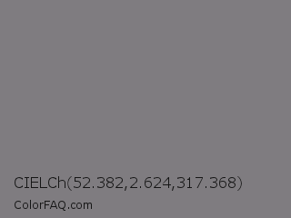 CIELCh 52.382,2.624,317.368 Color is a normal purple color and the nearest color is Jumbo #7c7b82. Hex code #7f7c80 and RGB value is rgb(127,124,128). In RGB color space, this color is composed of 50% red, 49% green, 50% blue, In CMYK color space, this color is composed of 1% cyan, 3% magenta, 0% yellow , 50% black , In HSL color space, this color has a hue angle of 285° , 2% saturation and 49% lightness.