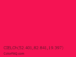 CIELCh 52.401,82.841,19.397 Color is a normal rose color and the nearest color is Red Crayola #ee204d. Hex code #f51353 and RGB value is rgb(245,19,83). In RGB color space, this color is composed of 96% red, 7% green, 33% blue, In CMYK color space, this color is composed of 0% cyan, 92% magenta, 66% yellow , 4% black , In HSL color space, this color has a hue angle of 343° , 92% saturation and 52% lightness.