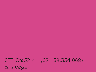 CIELCh 52.411,62.159,354.068 Color is a normal rose color and the nearest color is Pink Pantone #d74894. Hex code #d6468a and RGB value is rgb(214,70,138). In RGB color space, this color is composed of 84% red, 27% green, 54% blue, In CMYK color space, this color is composed of 0% cyan, 67% magenta, 36% yellow , 16% black , In HSL color space, this color has a hue angle of 332° , 64% saturation and 56% lightness.