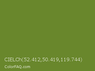 CIELCh 52.412,50.419,119.744 Color is a normal green color and the nearest color is Olive Drab #6b8e23. Hex code #69872c and RGB value is rgb(105,135,44). In RGB color space, this color is composed of 41% red, 53% green, 17% blue, In CMYK color space, this color is composed of 22% cyan, 0% magenta, 67% yellow , 47% black , In HSL color space, this color has a hue angle of 80° , 51% saturation and 35% lightness.