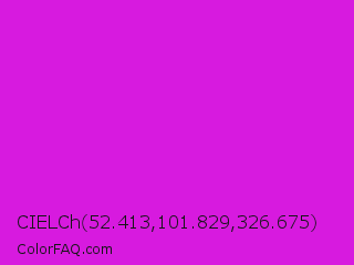 CIELCh 52.413,101.829,326.675 Color is a normal magenta color and the nearest color is Steel Pink #cc33cc. Hex code #d71adf and RGB value is rgb(215,26,223). In RGB color space, this color is composed of 84% red, 10% green, 87% blue, In CMYK color space, this color is composed of 4% cyan, 88% magenta, 0% yellow , 13% black , In HSL color space, this color has a hue angle of 298° , 79% saturation and 49% lightness.