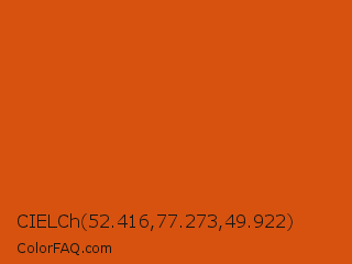 CIELCh 52.416,77.273,49.922 Color is a normal orange color and the nearest color is Red Stage #d05f04. Hex code #d7520f and RGB value is rgb(215,82,15). In RGB color space, this color is composed of 84% red, 32% green, 6% blue, In CMYK color space, this color is composed of 0% cyan, 62% magenta, 93% yellow , 16% black , In HSL color space, this color has a hue angle of 20° , 87% saturation and 45% lightness.