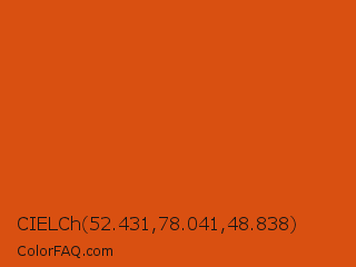CIELCh 52.431,78.041,48.838 Color is a normal orange color and the nearest color is Trinidad #e64e03. Hex code #d95011 and RGB value is rgb(217,80,17). In RGB color space, this color is composed of 85% red, 31% green, 7% blue, In CMYK color space, this color is composed of 0% cyan, 63% magenta, 92% yellow , 15% black , In HSL color space, this color has a hue angle of 19° , 85% saturation and 46% lightness.