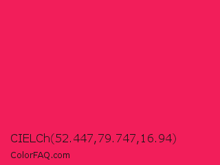 CIELCh 52.447,79.747,16.94 Color is a normal rose color and the nearest color is Red Crayola #ee204d. Hex code #f21e5a and RGB value is rgb(242,30,90). In RGB color space, this color is composed of 95% red, 12% green, 35% blue, In CMYK color space, this color is composed of 0% cyan, 88% magenta, 63% yellow , 5% black , In HSL color space, this color has a hue angle of 343° , 89% saturation and 53% lightness.