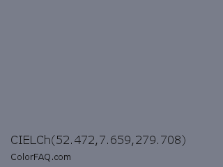 CIELCh 52.472,7.659,279.708 Color is a normal blue color and the nearest color is Topaz #7c778a. Hex code #797d8a and RGB value is rgb(121,125,138). In RGB color space, this color is composed of 47% red, 49% green, 54% blue, In CMYK color space, this color is composed of 12% cyan, 9% magenta, 0% yellow , 46% black , In HSL color space, this color has a hue angle of 226° , 7% saturation and 51% lightness.