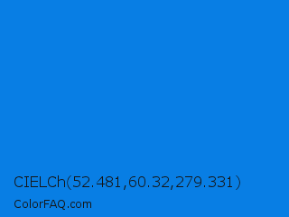 CIELCh 52.481,60.32,279.331 Color is a normal blue color and the nearest color is True Blue #0073cf. Hex code #087ee4 and RGB value is rgb(8,126,228). In RGB color space, this color is composed of 3% red, 49% green, 89% blue, In CMYK color space, this color is composed of 96% cyan, 45% magenta, 0% yellow , 11% black , In HSL color space, this color has a hue angle of 208° , 93% saturation and 46% lightness.