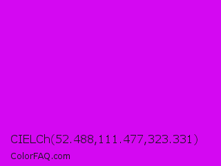 CIELCh 52.488,111.477,323.331 Color is a normal magenta color and the nearest color is Vivid Orchid #cc00ff. Hex code #d408f2 and RGB value is rgb(212,8,242). In RGB color space, this color is composed of 83% red, 3% green, 95% blue, In CMYK color space, this color is composed of 12% cyan, 97% magenta, 0% yellow , 5% black , In HSL color space, this color has a hue angle of 292° , 94% saturation and 49% lightness.