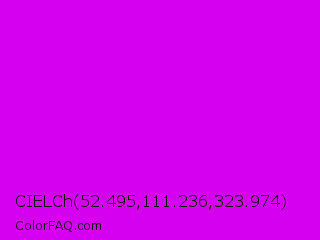 CIELCh 52.495,111.236,323.974 Color is a normal magenta color and the nearest color is Phlox #df00ff. Hex code #d600f0 and RGB value is rgb(214,0,240). In RGB color space, this color is composed of 84% red, 0% green, 94% blue, In CMYK color space, this color is composed of 11% cyan, 100% magenta, 0% yellow , 6% black , In HSL color space, this color has a hue angle of 294° , 100% saturation and 47% lightness.